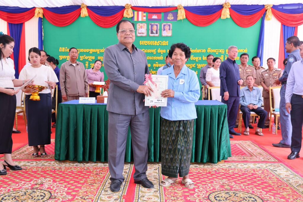 មានប្រសាសន៍បែបនេះនាឱកាស ឯកឧត្តម នូ សាខន ប្រធានក្រុមប្រឹក្សាខេត្ត និងឯកឧត្តម គួច ចំរើន អភិបាល នៃគណៈអភិបាលខេត្តកណ្ដាល បានអញ្ជើញជាអធិបរីចែកប័ណ្ណកម្មសិទ្ធិដីធ្លី ឬវិញ្ញាបនបត្រសម្គាល់ម្ចាស់អចលនវត្ថុចំនួន ២០,៦១៥ប័ណ្ណ ត្រូវបានអាជ្ញាធរខេត្តកណ្ដាល និងមន្ទីរជំនាញចែកជូនប្រជាពលរដ្ឋចំនួន ២៣ភូមិ ក្នុងឃុំទួលព្រេជ ស្រុកអង្គស្នួល នាព្រឹកថ្ងៃទី១១ ខែមីនា ឆ្នាំ២០២៦ នៅក្នុងបរិវេណវត្តឱង្ការ ស្ថិតនៅក្នុងភូមិថ្មី ឃុំទួលព្រេជ។