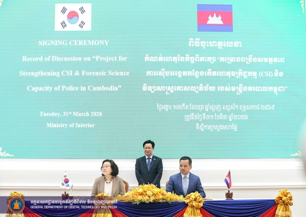 ឯកឧត្តមអភិសន្តិបណ្ឌិត ស សុខា ឧបនាយករដ្ឋមន្រ្តី រដ្ឋមន្រ្តីក្រសួងមហាផ្ទៃ និងឯកឧត្តម គីម ឆាងយ៉ុង (KIM Chang-yong) ឯកអគ្គរដ្ឋទូតនៃសាធារណរដ្ឋកូរ៉េ ប្រចាំព្រះរាជាណាចក្រកម្ពុជា បានអញ្ជើញជាសហអធិបតី និងចុះហត្ថលេខាក្នុងពិធីចុះហត្ថលេខាលើកំណត់នៃកិច្ចពិភាក្សា “គម្រោងពង្រឹងសមត្ថភាពការស៊ើបអង្កេតកន្លែងកើតហេតុឧក្រិដ្ឋកម្ម (CSI) និងវិទ្យាសាស្ត្រកោសល្យវិច័យ របស់មន្ត្រីនគរបាលកម្ពុជា” នៅសាលរាជធានីភ្នំពេញ នៃទីស្តីការក្រសួងមហាផ្ទៃ។